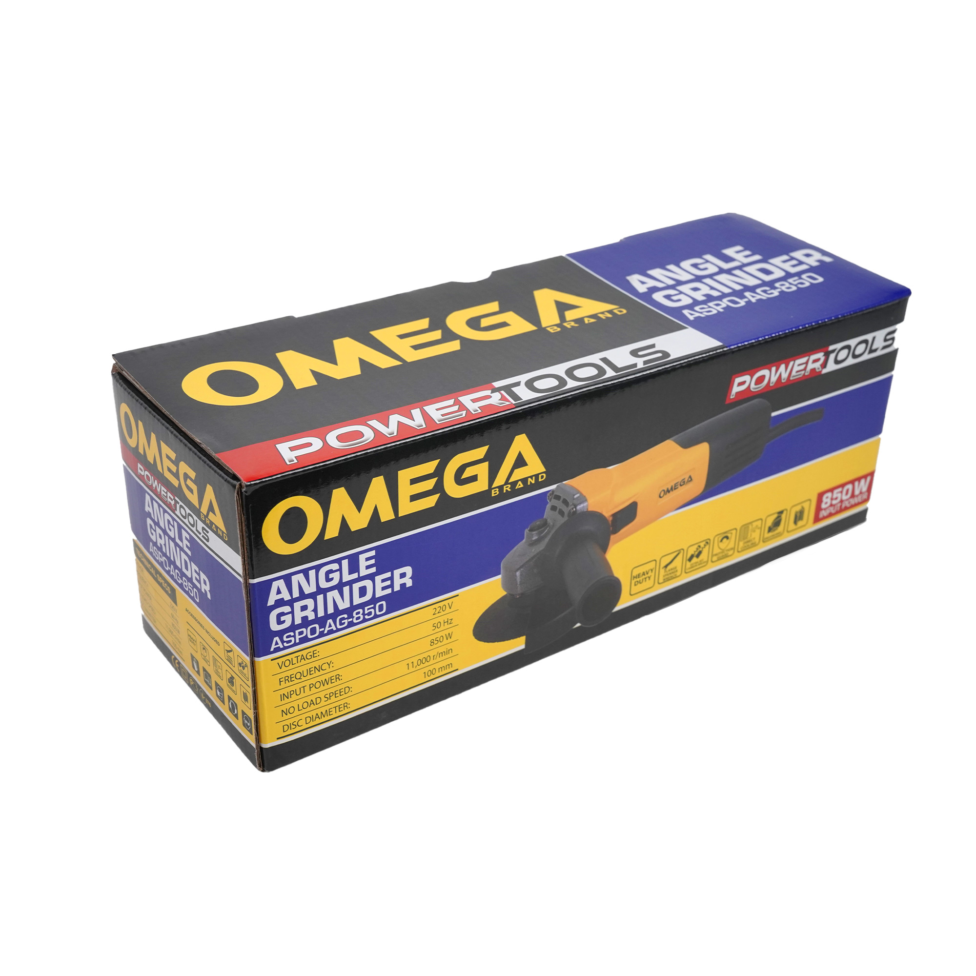 The Omega Angle Grinder ASPO-AG-850 is a high-performance tool designed for heavy-duty grinding, cutting, and polishing applications. Powered by an 850 W motor and delivering a no-load speed of 11,000 RPM, it provides the power and efficiency needed for professional and DIY tasks. Its 100 mm disc diameter is perfect for precision work on metal, masonry, and other materials.